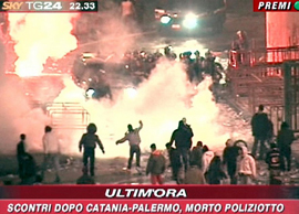 Au moment de calciopoli, je m’étais dit, naïf, «cette fois, ils vont pas s’en sortir à l’italienne, c’est pas possible ! Les yeux du monde sont braqués sur nous, les preuves sont là… Non, cette fois y aura pas d’entourloupe possible, les fautifs vont payer». Foutaises. Les sanctions proférées dans le cadre de l’affaire équivalent à «soigner un cancer avec une aspirine» (selon Saint-Zeman, protecteur des amoureux du foot et des justes). Comment voulez-vous que la mort d’un policier, un simple flic, vienne bousculer l’ordre des margoulins ? Les intérêts des puissants ? Et ne venez pas me dire que ça n’a rien à voir avec la violence des ultras… Car la violence peut être physique, comme elle peut également prendre une forme plus symbolique. Mais il s’agit toujours de violence ! La violence, c’est Moggi qui ment à l’Italie pendant 10 ans. La violence c’est Galliani président de la Ligue et haut-dirigeant d’un club majeur. La violence c’est Sky, Mediaset, et leurs contrats à la tronche du client. La violence ce sont les journalistes, qui passent des heures le dimanche soir à insulter les arbitres après s’être convaincus au bout du 73ème ralenti que l’homme en noir aurait dû siffler pénalty. La violence c’est se foutre de la gueule des supporters, en offrant des stades pourris, parce que de toute manière on s’en fout, les TV diffusent les matches (même à huis clos, à bon entendeur…). Comment veut-on, dans un pareil contexte, assister à autre chose qu’à des guerres de tranchées ? Dans un stade italien, les supporters consacrent 20% de leurs chants à l’encouragement de leur équipe. Les 80% restants sont des insultes, des chants «anti», contre l’adversaire, l’arbitre, la police… Le même climat d’hystérie agressive qui règne sur les plateaux TV justement, ou dans les aulas du Parlement… Faites vos comptes.