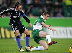 Après Schalke 04, Benaglio et Wolfsburg ont éliminé un autre grand d’Allemagne, le SV Hambourg, 2-1 après prolongations. Le portier helvétique a une nouvelle fois livré un match solide, réussissant notamment un arrêt magnifique sur un tir de Jarolim (ça tombe bien, on ne doit pas jouer les Tchèques bientôt ?). Il a certes dû s’incliner sur une frappe phénoménale de Van der Vaart (pas grave, on ne jouera pas la Hollande avant la finale…) mais dans la prolongation Marcelinho a donné la victoire aux Wölfe. Les demi-finales, dont le tirage au sort a lieu dimanche, réuniront donc Bayern Munich, Borussia Dortmund, Carl Zeiss Jena et VfL Wolfsburg. On ne serait pas contre un petit Borussia Dortmund – Bayern Munich au Westfalenstadion, où le brave Luca Toni (même s’il sera suspendu) a déjà une chanson rien que pour lui mais je m’interdirai de la répéter ici.