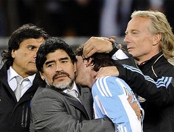 Diego Armando Maradona, dont le coaching a été catastrophique tout au long de la partie. Ne vous méprenez pas : je respecte énormément le personnage, et faisais partie de ceux qui pensaient que grâce à son aura, ses élèves parviendraient à aller jusqu’au bout. Mais à force de s’enfermer dans ses certitudes, de faire le pitre en conférence de presse et d’afficher une confiance en soi dépassant allégrement l’arrogance, l’idole de tout un peuple a oublié d’apporter à son équipe ce dont elle avait réellement besoin : des leaders d’expérience (Cambiasso et Zanetti doivent sourire) et une rigueur tactique trop souvent négligée dans cette partie du monde. Comme quoi, le nom d’un entraîneur ne suffit pas forcément à assurer son succès.