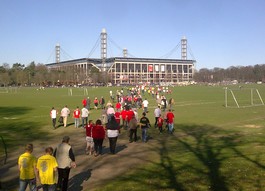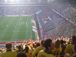 Ce n’était que partie remise et le foudre va s’abattre sur les Geissböcke dès la reprise : un coup franc astucieusement joué permet à Piszczek de remiser pour Shinji Kagawa qui arme une volée surpuissante sous la latte pour donner l’avantage au BVB. Alors que les joueurs colonais étaient encore en train de pleurnicher vers l’arbitre pour une main collée au corps de Subotic qui ne donnait matière à siffler rien du tout, Dortmund allait classer l’affaire sur un but d’anthologie : une percée de Kuba, Kagawa relaie d’une talonnade géniale et le Polonais peut servir son compatriote Robert Lewandowski qui n’a plus qu’à marquer dans le but vide. Deux goals juste après la mi-temps, c’est très dangereux car les verres sont encore pleins. C’est donc un véritable déluge de bière qui s’abat dans le Gästeblock en signe d’allégresse, je suis bien content d’être assez en haut dans la tribune : même si la température est estivale, ce n’est jamais très agréable de se coltiner six heures de trajet de retour avec des vêtements qui collent et sentent la bière.