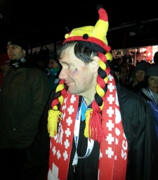 Après une soirée mémorable, marquée notamment par une combustion d’un maillot Götze, nous sommes de retour au Schantze. On croise plein d’amis, on se dit qu’on a dû faire assez fort la veille. Le concours s’est passé comme dans rêve. Comme dit en préambule, je suis Olaf mais j’avais aussi une écharpe de la Suisse. Et j’ai pu l’agiter. Première manche, c’était pas flagrant que Simi était devant, on était pas très au clair avec ces lignes sur la piste. Deuxième manche en revanche, on a vu qu’il avait assuré, il était pas posé qu’on commençait à faire la fête. Oberstdorf est magique !