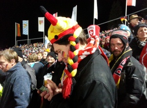 Début donc des bières à 7h15 au lever du soleil, le GO de la journée avait décidé de commencer la descente «depuis Zürich seulement», il aura tenu parole – contrairement à nous qui avons commencé à Saint-Aubin – mais depuis n’a pas réussi à ramener son taux d’alcool à 0. Des parties de cartes perdues («Mais putain, pourquoi on a pas fait pique double?», «T’as stoerkrrr où ?»), quelques tournées de Feiglings «yeeeeeeeeeeeh, santé», on arrive gentillement à Oberstdorf après une rencontre improbable avec une bande de Nyonnais, seuls vrais francophones de la journée (mis à part mes deux compagnons et demi). Check-in standard à l’hôtel et départ pour le SchattenbergSchantze. Une arène impressionnante de 25’500 spectateurs (98% d’austro-germains, 1.99% de suisses, et 1 Français).