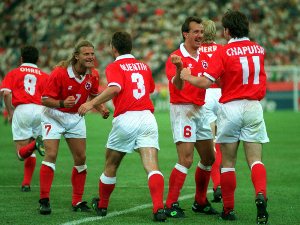 L’équipe de Suisse de 1994. Probablement l’une des meilleures équipes suisses de tous les temps. Une qualification pour les Etats-Unis historique avec cette victoire contre l’Italie à Berne (j’en pleure encore, mais pas probablement pour les mêmes raisons) sur un but de Marc Hottiger et ce festival offensif contre l’Estonie pour clore la qualification devant les rivaux portugais et écossais. On se remémore la ferveur qu’il y avait pu avoir autour de cette World Cup, une fête du football à laquelle participait pour une fois la Nati, après plus de vingt ans d’absence. Le premier match de l’équipe dirigée par le mythique Roy Hogdson avait un peu laissé sur leur faim la plupart des supporters suisses. Un score de 1-1 face à l’hôte du tournoi, réputé assez faible. Une partie qui se résume à une histoire de coup-franc puisque Georges Bregy et Eric Wynalda en avaient chacun inscrit un de superbe manière peu avant la mi-temps. Un point somme toute service minimum pour une Suisse qui avait dominé les débats mais qui s’était exposée aux dangereux contres de Wynalda, Harkes, Stewart et consorts.