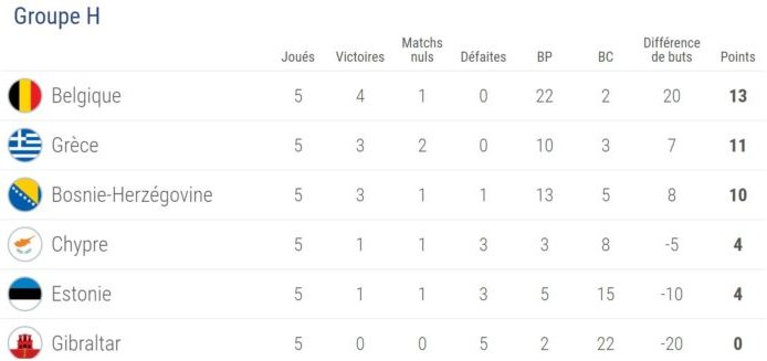 La Belgique n’est donc pas à l’abri d’un faux pas qui pourrait profiter soit à la Grèce, soit à la Bosnie. A noter que les deux poursuivants s’affronteront en juin à Zenica, et que les Diables doivent encore se rendre chez l’un comme chez l’autre.