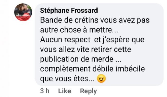 Que tous les Stéphane Frossard du monde nous foutent la paix et soient persuadés que l’on va continuer à publier des posts du même acabit. Car même si tu ne les aimes pas, ils ont deux grands mérites : ils me font rire, et dans l’enchaînement des tas de braves gens qui n’avaient rien à foutre sur notre page nous quittent en colère. Ce sont des posts qui font chasse d’eau.