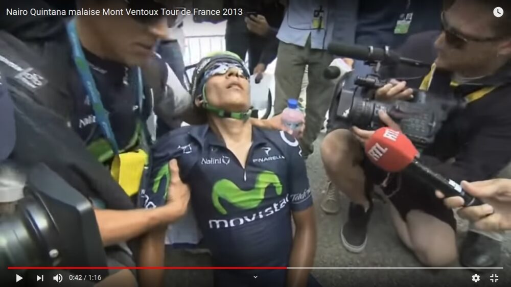 Mais c’est sur le Tour de France 2013 qu’il crève véritablement l’écran en suppléant son leader Valverde piégé dans une bordure à mi-Tour du côté de Saint-Amand-Montrond. Après avoir failli s’imposer en première semaine à Ax 3 Domaines, le Condor se montre une nouvelle fois héroïque sur les pentes du Ventoux en tenant tête au surpuissant Chris Froome et à son vélo déchaîné à 110 tours/minute au passage du Chalet Reynard. 2ème sur le toit du Géant de Provence, il manque de s’évanouir une fois la ligne d’arrivée franchie. Placé sous oxygène, la France découvre là Nairoman, ce petit paysan colombien sympathique au corps de poulet (1 m 67 pour 58 kilos) en opposition avec les élancés et arrogants coureurs britanniques de la Sky. Six jours plus tard, Quintana triomphera au Semnoz pour conclure son premier Tour de France à une brillante 2ème place avec le maillot de meilleur jeune et de meilleur grimpeur sur les épaules.