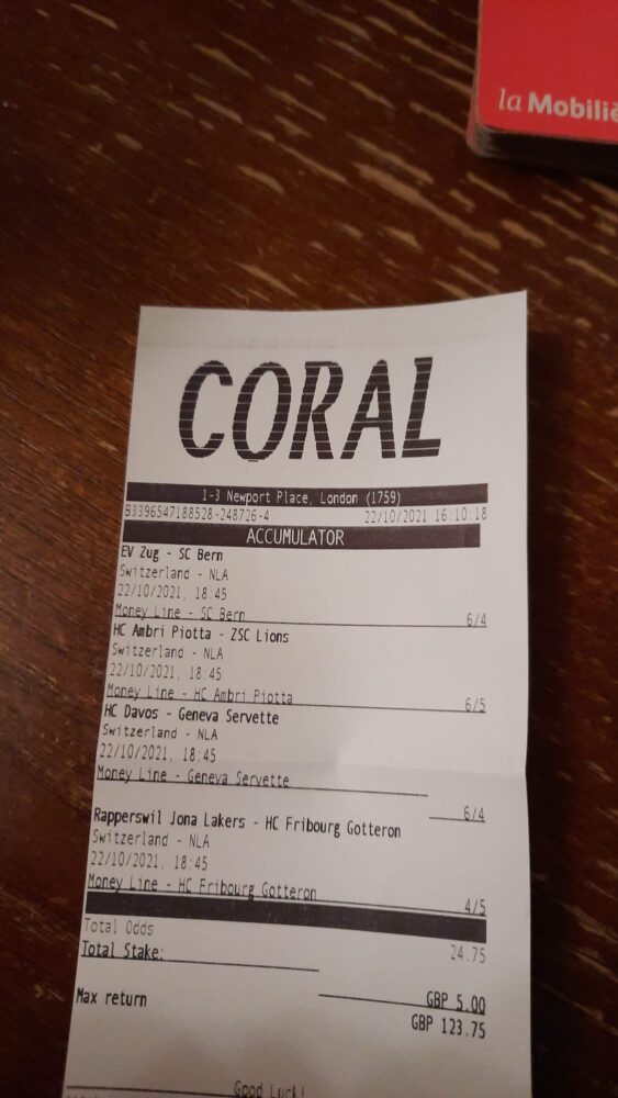 J’aime bien et me prends au jeu. En plus je m’aperçois que même depuis la Chinatown de Londres je peux miser sur une 11ème victoire de suite de Gottéron, faut en profiter ! Et pourquoi pas un autre cumulé à 5£ en misant encore sur Genève, Berne et Ambri ? Waaaaah c’est probable et si je gagne je me fais à peu près 450£. Trop beau, je vais pouvoir payer une soirée à tous mes copains !