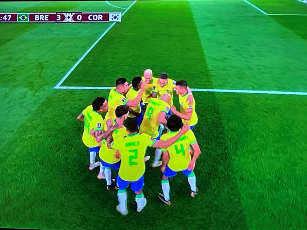 La danse à la con que les Brésiliens ont fait après chaque but : les joueurs font une ronde et mettent l’un des leurs qui fait semblant de rire au milieu, puis ils tournent et lui donnent des claques sur la tronche. On avait pas fait pire depuis la petite chorégraphie de Pogba après le 3-1 face à la Suisse à l’Euro 2021, juste avant la remontée…