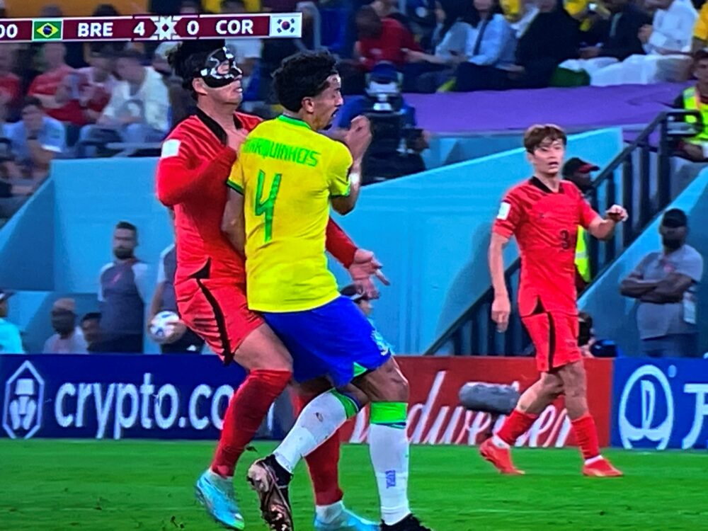 Le masqué Heug-Min Son qui à la 41ème minute, s’écroule en se tenant la tête, les Brésiliens stoppant le jeu immédiatement par fair-play. C’est clair, quand tu dois déjà porter un masque et que tu prends encore une mornifle sur le nez, ça fait mal.