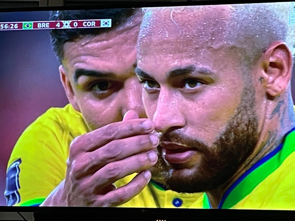 Le coup d’envoi donné par M. Turpin. Les ennuis des Coréens ont immédiatement commencé: 1er but encaissé à la 6ème minute (le gladiateur Vinicius qui  a été oublié dans les 16 et qui a disposé de 20 bonnes secondes pour ajuster son tir), penalty et 2-0 à la 10ème par Neymar, d’un tir que même ma grand-mère en fauteuil roulant elle tirerait plus fort. Et enCoréen, et enCoréen. C’était déjà 4-0 à la mi-temps.
