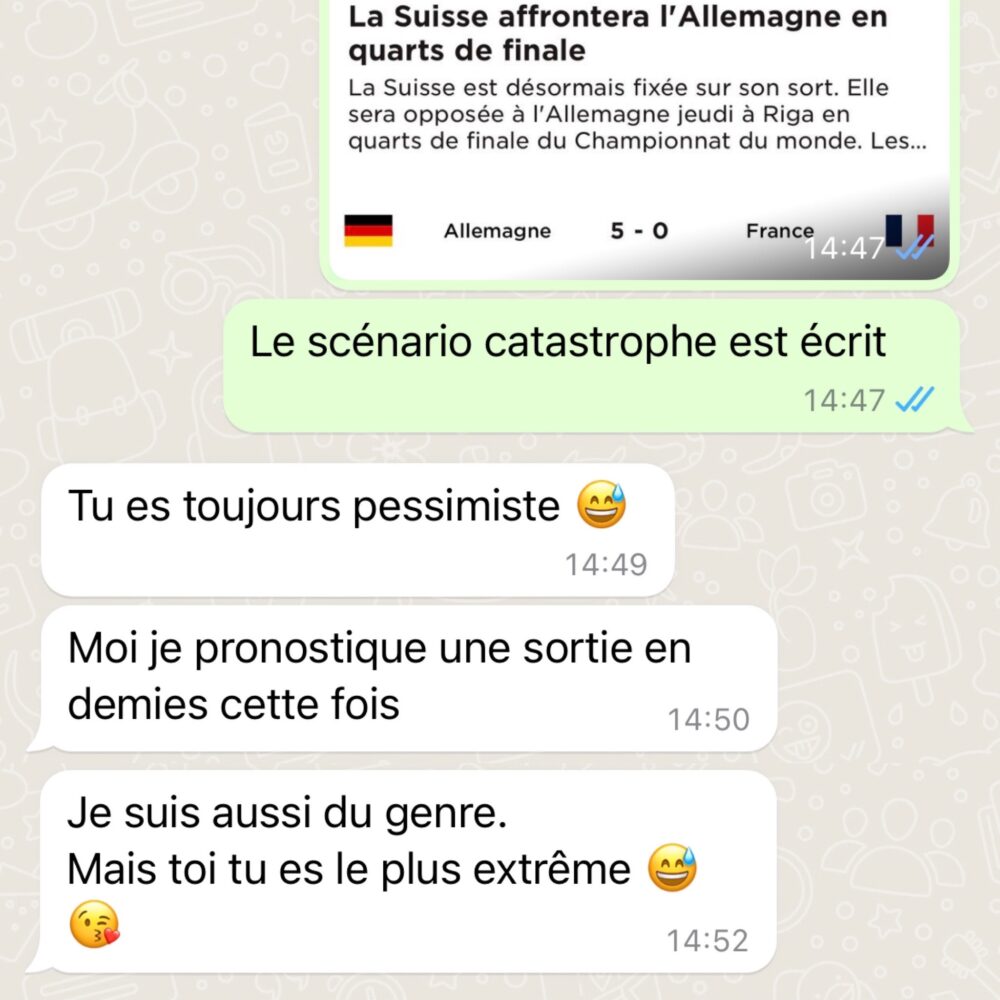 18-11. C’était, selon nos doctes recherches Google, le bilan des rencontres Suisse-Allemagne depuis 2004. L’ennui étant que les deux derniers matches couperets entre les deux formations s’étaient soldés par une victoire teutonne (1/4 de finale du Mondial 2021, 1/8 de finale des JO 2018). De quoi apporter des kilolitres d’eau à l’imposant moulin d’un défaitisme typiquement helvétique.