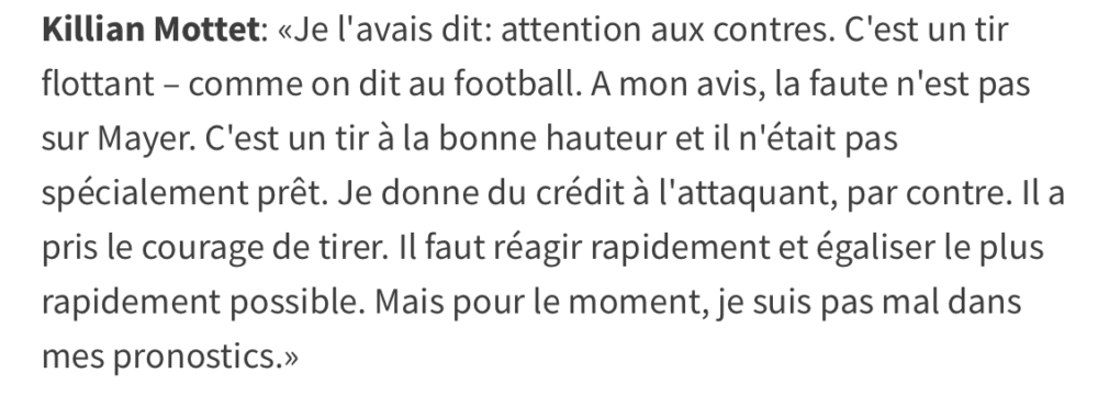 Robert Mayer, qui n’a absolument rien à se reprocher. En tout cas selon Killian Mottet, dont l’apport en tant que consultant dans le cadre du live ticker de Blick semble aussi indéniable que l’expertise d’Hugo Gaston en matière de fair-play ou celle de Marc-Andrea Hüsler comme préparateur mental avec spécialisation terre battue. Même Maximilian « Kevin » Kastner, le Robin des Bois germanique auteur du 0-1 sur un rotoillon sorti du fond des âges (7ème minute), doit avoir un peu de mal à partager cette analyse de comptoir. Littéralement de comptoir d’ailleurs, puisque les préposés audit live ticker se trouvaient devant un écran des Gosses du Québec de Fribourg.