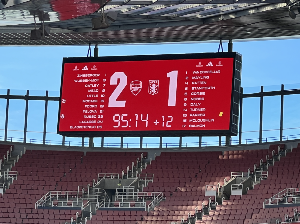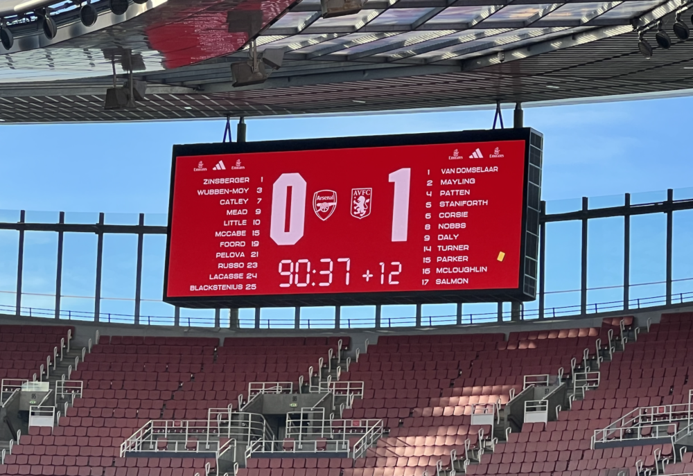 Le moment où la quatrième arbitre a annoncé DOUZE MINUTES d’arrêts de jeu. Aston Villa était venu pour défendre et il a fait exactement ça (5 tirs contre 28 (!), 35% de possession, une seule réelle occasion*, un but de Maz Pacheco à la 25ème minute). Mais personne ne lui avait dit que le match ne se terminait pas à l’appel des 90 minutes réglementaires.