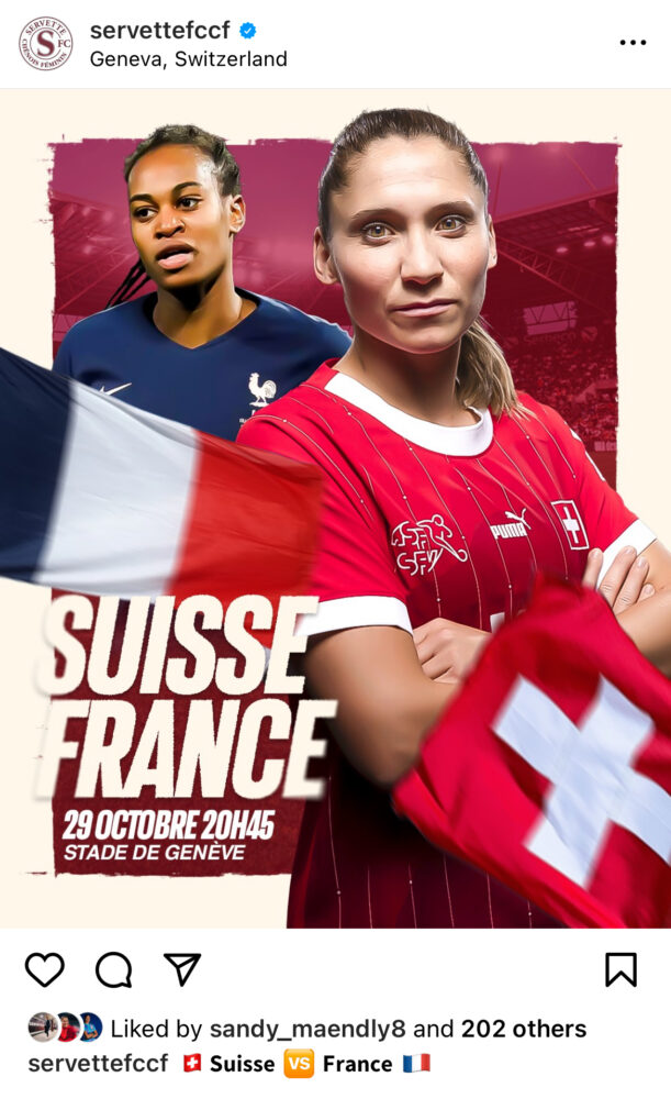 Et le prochain match au Stade de Genève ? Un alléchant amical Suisse-France le 29 octobre prochain ! Le community manager du SFCCF en a perdu le contrôle de ses filtres Instagram de joie :